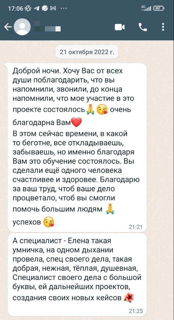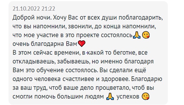 Елена Ливада помогла многим людям разобраться в себе, обрести уверенность и инициировать перемены в жизни. Такие отзывы – лучшая похвала для специалиста, и ваша история может быть следующей, если вы не упустите возможность, прямо сейчас зарегистрируетесь на вебинар и получите ценную и важную информацию абсолютно бесплатно!